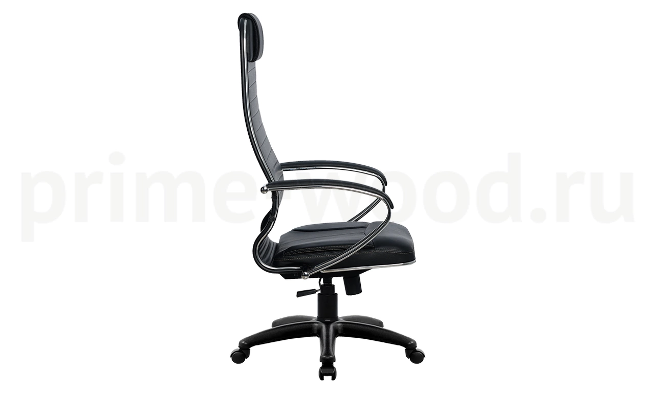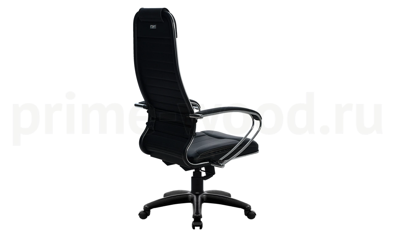 Спинка: высокая с мягким подголовником, черное полимерное покрытие каркаса с хромированным молдингом, ширина 475 мм